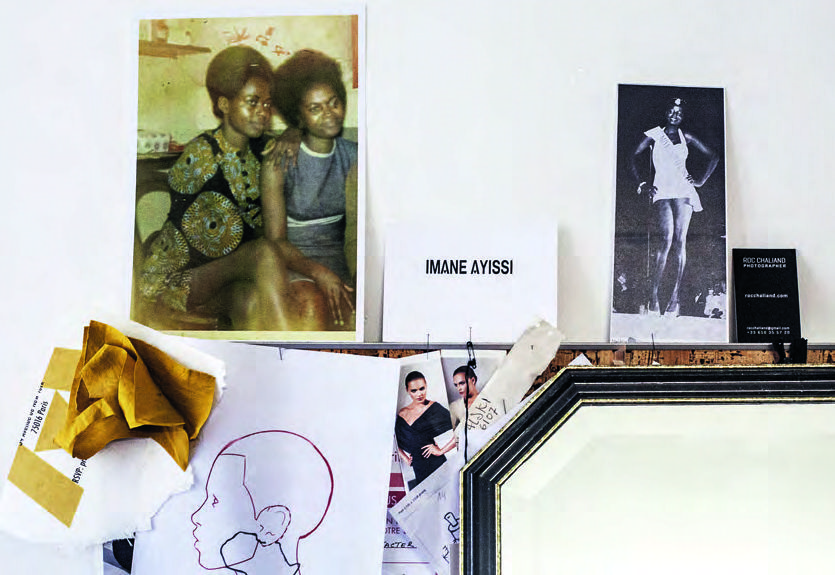 N’oublions pas que la mode est un dictateur, elle impose. Ces maisons ont ainsi fait leur politique d’image. Mais je ne le prends pas pour du racisme. Rappelons qu’Yves Saint Laurent ne faisait pas une cabine sans un mannequin noir, ni Chanel, Dior, Valentino, Paco Rabanne… Au lieu d’attendre des autres et de leur chercher la petite bête, créons nous-mêmes notre propre luxe. Travaillons, formons nos gens… Ainsi, le secteur de la mode en Afrique évoluera. Soyons forts, soutenons-nous pour nous imposer ensuite au monde. Achetons les pièces de nos créateurs, ça les aidera à s’implanter, à se développer. Parmi les souvenirs fixés au mur de son atelier, deux photos de sa première muse, sa mère (en tenue imprimée sur celle de gauche et en Miss Cameroun sur celle de droite). AMANDA ROUGIER