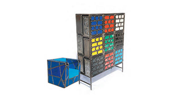 Cet artiste de 41 ans, à qui l’espace culturel le 104 à Paris a consacré une rétrospective en 2014, s’inscrit dans l’écosystème de sa ville, sans complexes. Il en tire ses inspirations pour ses meubles, qu’il a d’abord fabriqués à partir d’anciennes conduites d’eau et de fûts de pétrole. Aujourd’hui, il travaille des feuilles de métal neuves et colorées, qu’il plie à son bon vouloir avec l’aide de ses apprentis, et qu’il mélange allègrement à d’autres matières – notamment le cuir pour ses fauteuils. Son best-seller : un tabouret tout en courbes inspiré des « petits bancs » qui pullulent au Sénégal, très confortables, conçus pour donner une bonne assise à toutes les tailles de postérieur.