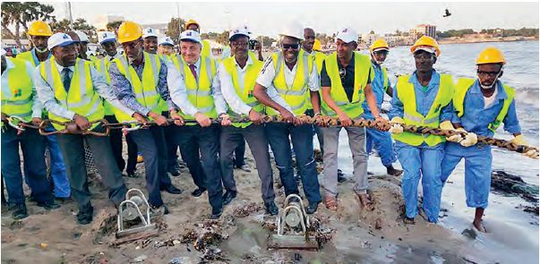 Gateway (EIG) appartient à un consortium composé de 18 opérateurs, dont Djibouti Télécom. Il raccorde l’Inde à l’Europe occidentale avec une capacité de 1,28 térabit par seconde et permet de faire face à l’explosion du trafic de voix et de données entre l’Asie et l’Europe. Le Seacom, lui, relie l’est et l’ouest de l’Afrique à l’Europe et l’Asie du sud. Avec ses 39 000 km, le SEA-ME-WE 3 (Asie du Sud-Est - Moyen-Orient - Europe de l’Ouest) est le câble sous-marin le plus long du monde. Il fait le lien, à lui seul, entre quatre continents et 33 pays, de la Scandinavie à la Nouvelle-Zélande et de la Corée du Sud à la péninsule ibérique, le tout en passant par la station de Haramous à Djibouti. Quant au AAE 1 (Afrique-Asie-Europe), il raccorde depuis 2017 Hong Kong à Marseille. Djibouti Télécom tire de ce câble une capacité de transmission de 1,8 térabit par seconde. Enfin, le SEA-ME-WE 5, qui connecte Singapour à Toulon, permet à l’opérateur historique une capacité supplémentaire de 500 gigabits par seconde.DR ; Atterrissage en février 2016 d’un câble sous-marin de fibre optique sur la plage de la Siesta, dans la capitale, en présence d’Ali Hassan Bahdon (2e en partant de la droite), alors ministre de la Communication, chargé des Postes et Télécommunications, et désormais ministre de la Justice.