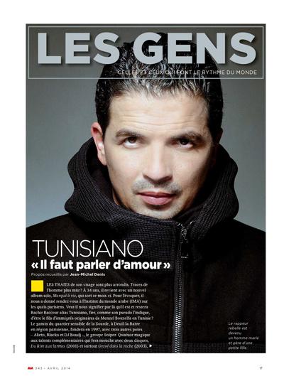 Le gamin du quartier sensible de la Sourde, à Deuil-la-Barre en région parisienne, fondera en 1997, avec trois autres potes Aketo, Blacko et DJ Boudj, le groupe Sniper. Quatuor magique aux talents complémentaires qui fera mouche avec deux disques, Du Rire aux larmes (2001) et surtout Gravé dans la roche (2003), album-phare du rap français (plus de 600 000 exemplaires vendus !). Car Sniper-la-colère tire sur tout ce qui bouge : la religion, le racisme, le conflit israélo-palestinien, l’extrême droite… Et enthousiasme les cités françaises, la jeunesse maghrébine et gratte là où ça fait mal. Nicolas Sarkozy, alors ministre de l’Intérieur, qualifiera même le groupe de « voyous qui déshonorent la France » ! Par la suite, Sniper devient un trio, avec le départ de DJ Boudj, sur Trait pour trait (2006) puis finalement un duo sur À toute épreuve (2011), réalisé sans Blacko. Parallèlement, Tunisiano se lance en solo et sa voix acide fait merveille dans de multiples collaborations (avec Diam’s, Zaho, Amel Bent, Zahouania, Cheb Bilal, Rim’K, Soprano, Youssoupha, etc.). Mais laissons parler l’artiste…