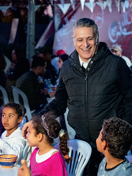 Il sillonne la Tunisie déshéritée, entouré de camions, de médecins, de denrées. Et il s’éloigne dans le même processusdu président et de la coalition au pouvoir. Répercutée par Nessma TV, la caravane qu’il mène sur le terrain provoque une formidable adhésion populaire. Il se substitue aux services publics défaillants. Comme pour Kaïs Saïed, il y a chez lui quelque chose d’assez radical dans l’approche, dans la volonté de rompre avec les habitudes et l’organisation du « système ». Mais « NK » est un self-made-man qui croit en lui, un ambitieux qui se dope aux objectifs. Il croit en une Tunisie modernisée, émergente, efficace, à une rénovation qui permettrait aux classes défavorisées d’entrer dans le wagon du développement. Il y a aussi de l’équilibrisme dans cette approche. Il s’agit, à la fois, de parler à la Tunisie des déshérités et d’engager une transformation économique par le haut. On est dans la disruption économique, pragmatique, loin finalement de tout discours postrévolutionnaire ou idéologique. Cloué au pilori par les partis et une certaine bourgeoisie, qui le jugent avant même que les magistrats ne se soient prononcés, « NK » avance dans l’adversité. Faute de visibilité, il perd du terrain. Mais son épouse, Salwa, le représente, transmet ses messages, fait campagne, suscitant une certaine admiration dans l’opinion. Son parti, Kalb Tounes (« Au coeur de la Tunisie »), est totalement mobilisé en vue des élections législatives de début octobre. Et dans les sondages, la formation est souvent en tête.