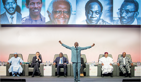 Youssou N’Dour à la tribune de l’ouverture du Partenariat mondial pour l’éducation, à Dakar, en février 2018, entouré de Macky Sall, d’Emmanuel Macron et de chefs d’État africains. JEAN-CLAUDE COUTAUSSE/DIVERGENCE POUR LE MONDE